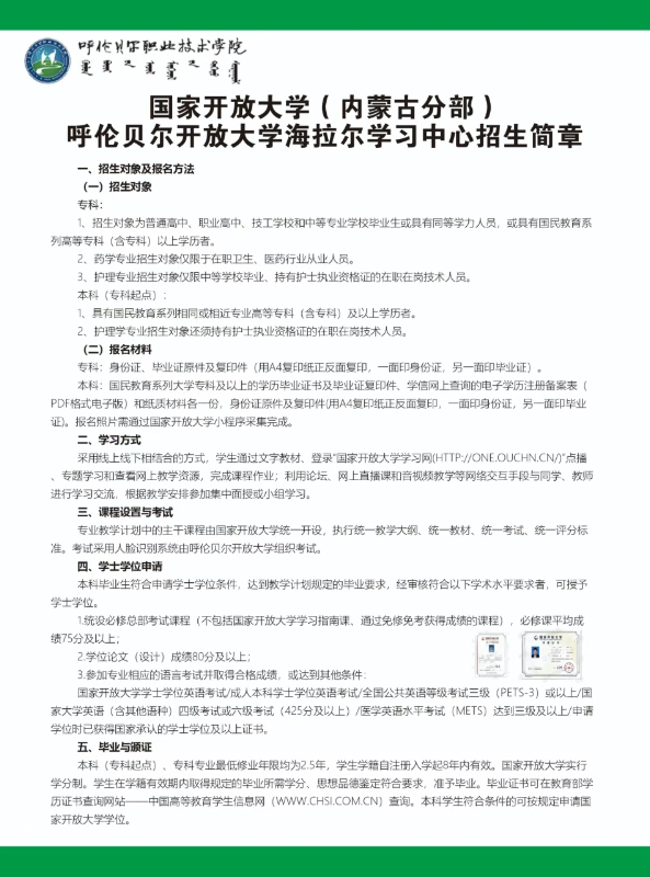 开放大学呼伦贝尔职业技术学院学习中心2023秋季招生简章