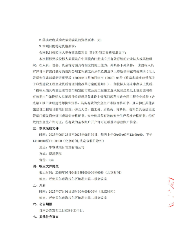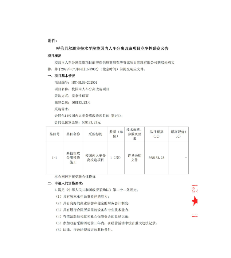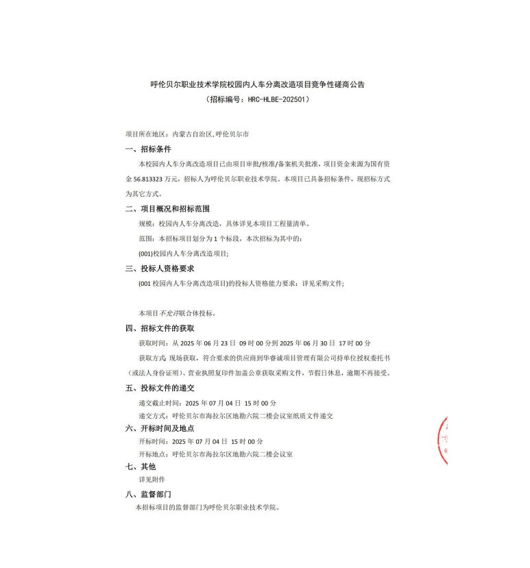 呼伦贝尔职业技术学院校园内人车分离改造项目竞争性磋商公告(招标编号:HRC-HLBE-202501)