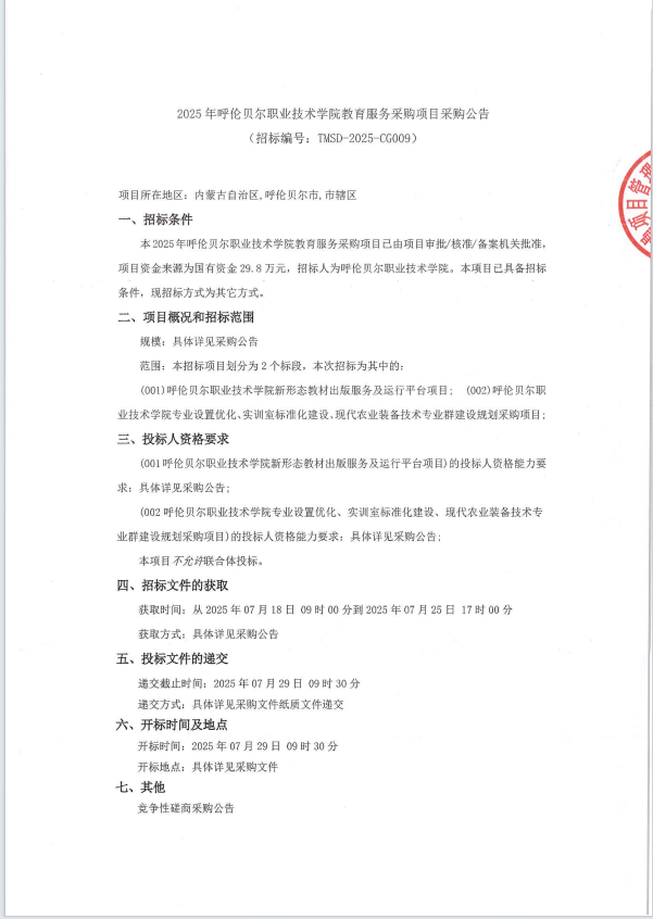 2025年呼伦贝尔职业技术学院教育服务采购项目采购公告(招标编号:TMSD2025-CG009)